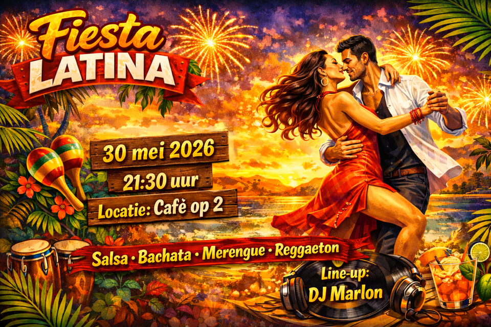 Hou je van latin dansen kom dan naar de Fiesta Latina bij Cafe op 2. Dans salsa, merengue, bachata en reggaeton op de latin muziek van DJ Marlon.