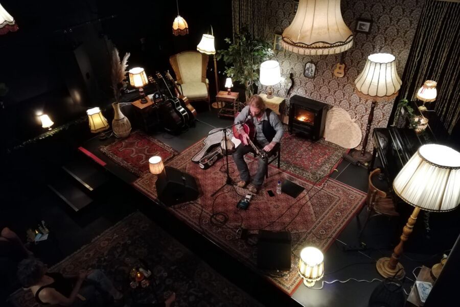 Geen grootse podia of luide versterkers, maar zachte verlichting, kleedjes en schemerlampen die de ruimte vullen met warmte. Artiesten brengen hun muziek terug naar de essentie, akoestisch en persoonlijk, in een setting waarin elk detail hoorbaar wordt en elk verhaal nog dieper binnenkomt.
