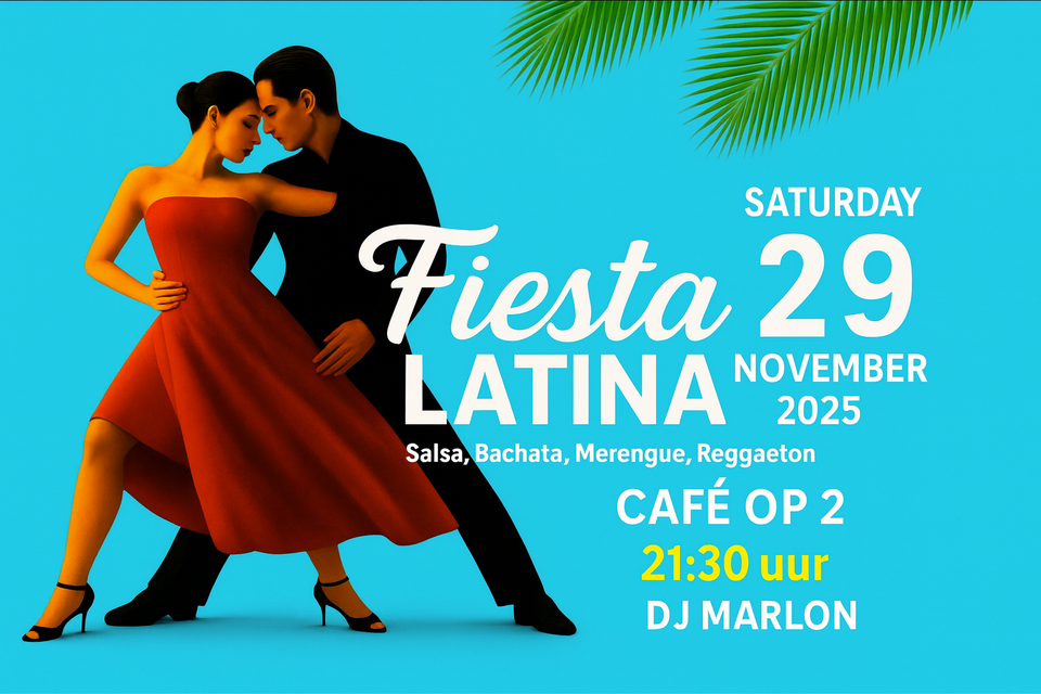 Fiesta LatinaFiesta Latina  Fiesta Latinazaterdag 1 november Hou je van latin dansen? Kom dan naar de Fiesta Latina bij Cafe op 2. Café op 2Bekijk evenement Fiesta LatinaMuziek overig