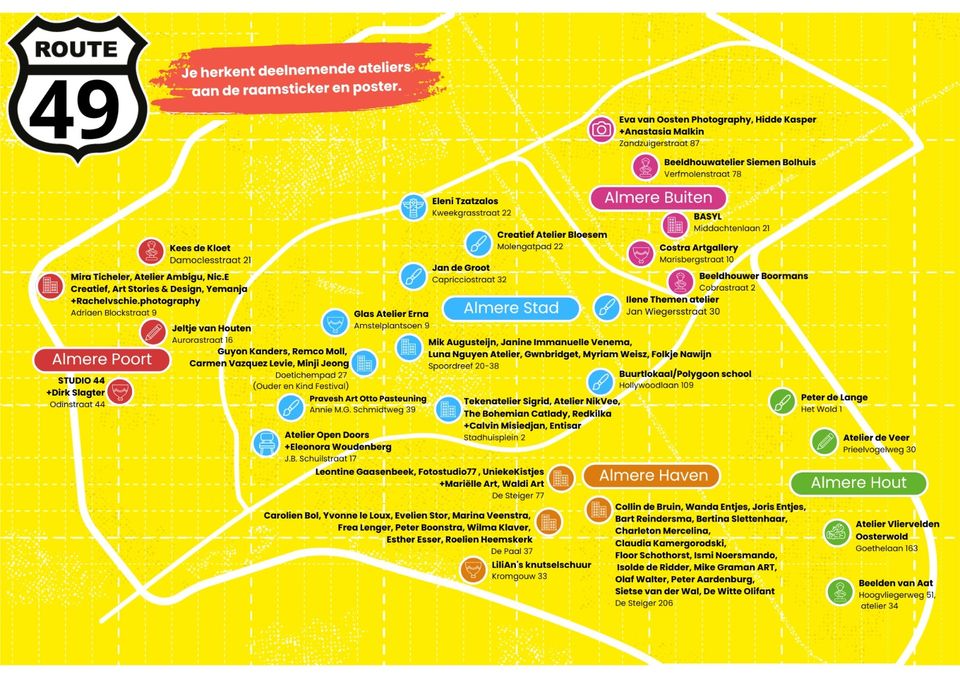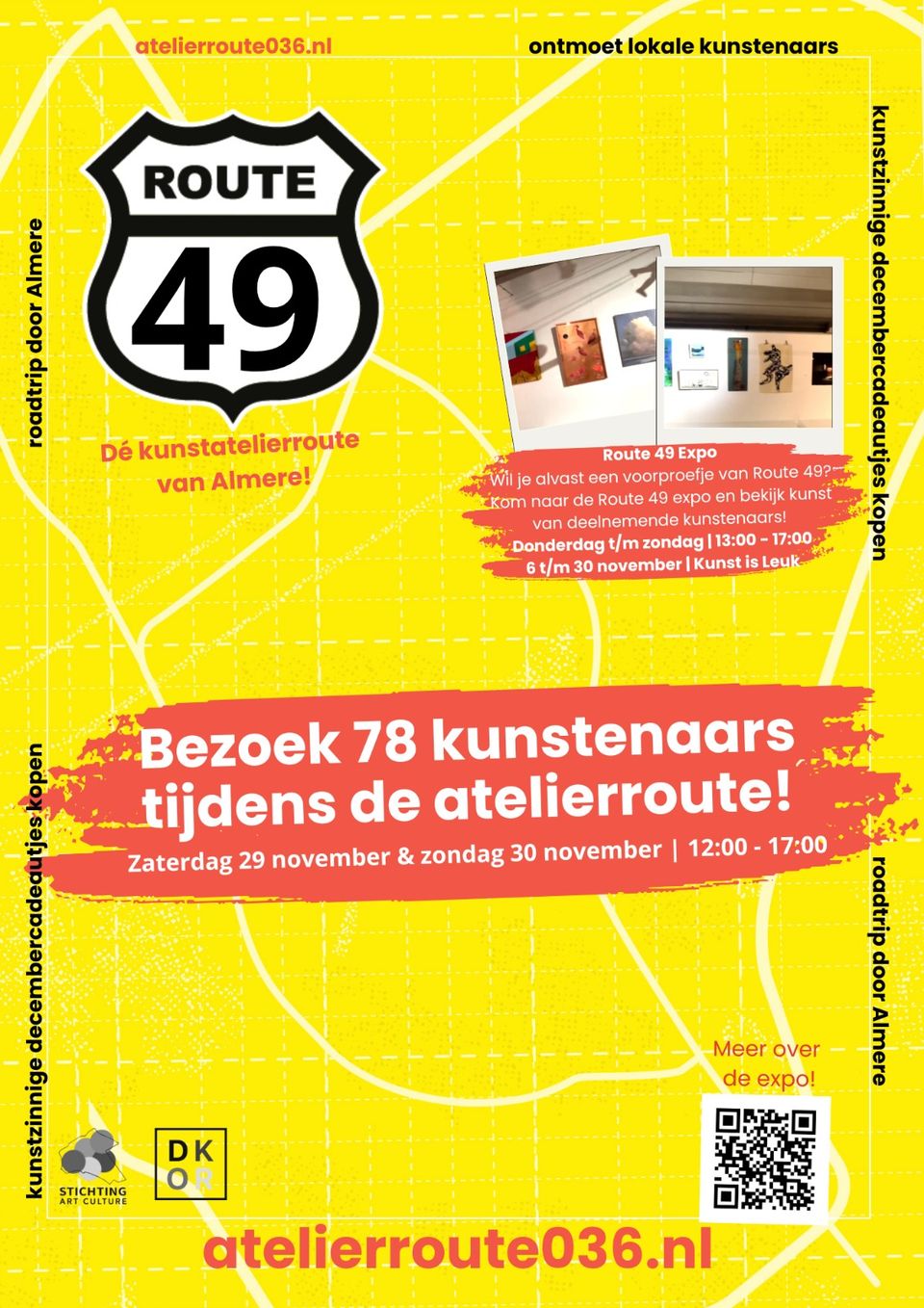 Op zaterdag 29 en zondag 30 november openen meer dan 70 kunstenaars van Route 49 hun ateliers voor publiek. Bezoekers zijn op beide dagen van 12.00 tot 17.00 uur welkom om de ateliers te bekijken, de kunstenaars te spreken en kunst te beleven. Buurtbewoners, Almeerders uit andere stadsdelen en bezoekers uit de regio zijn van harte uitgenodigd om een kijkje te komen nemen.
