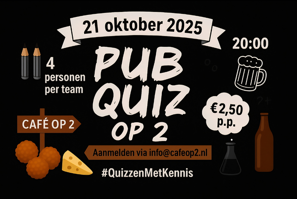 Speel mee in onze befaamde pub quiz bij Cafe op 2. Geef je snel op via info@cafeop2.nl. Deelname...